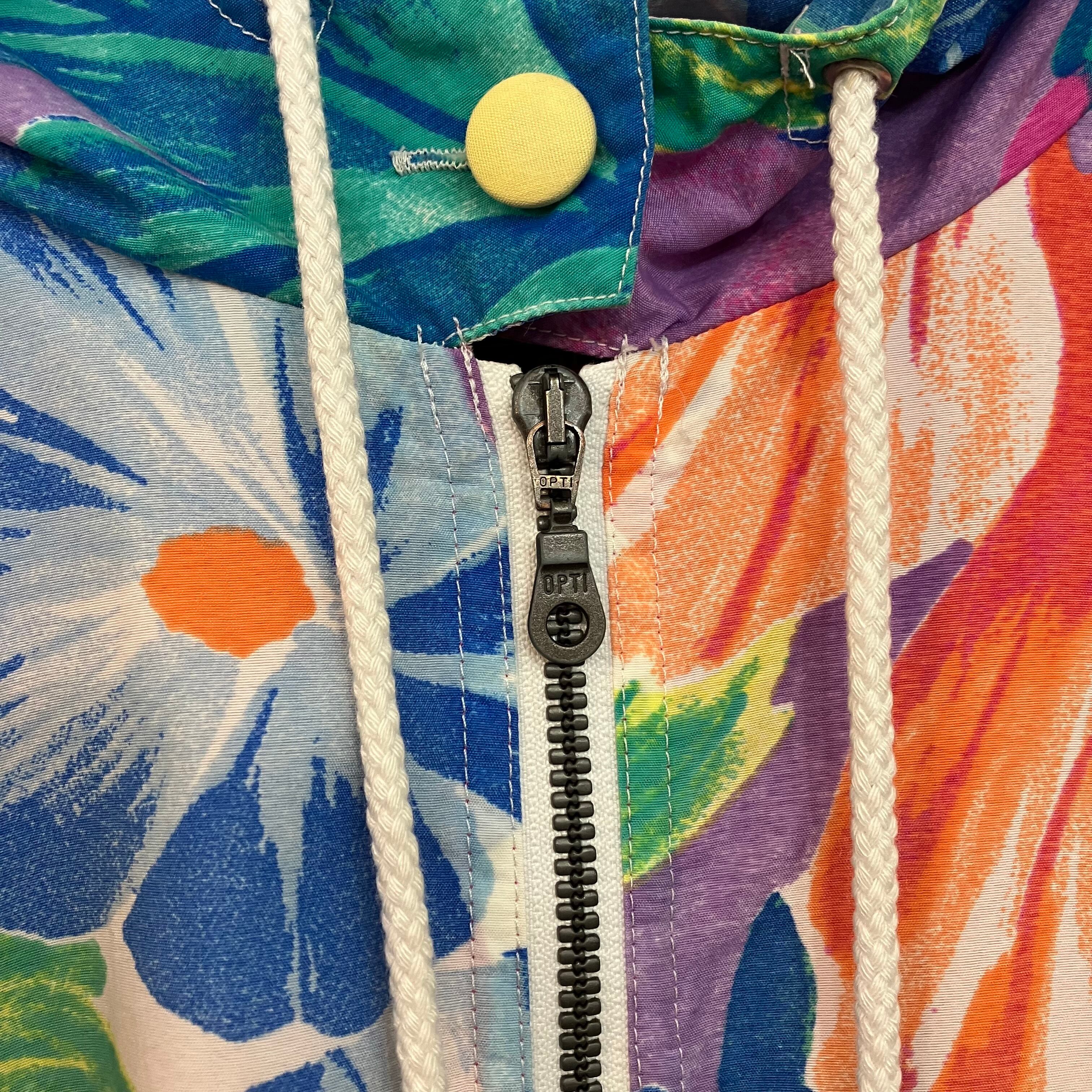 身幅の広めなゆったりとしたシルエットで、白、ピンク、紫、オレンジ、青、緑、などとてもカラフルな色で前面に花がデザインされているインパクトの強いジップフーディージャケットです。