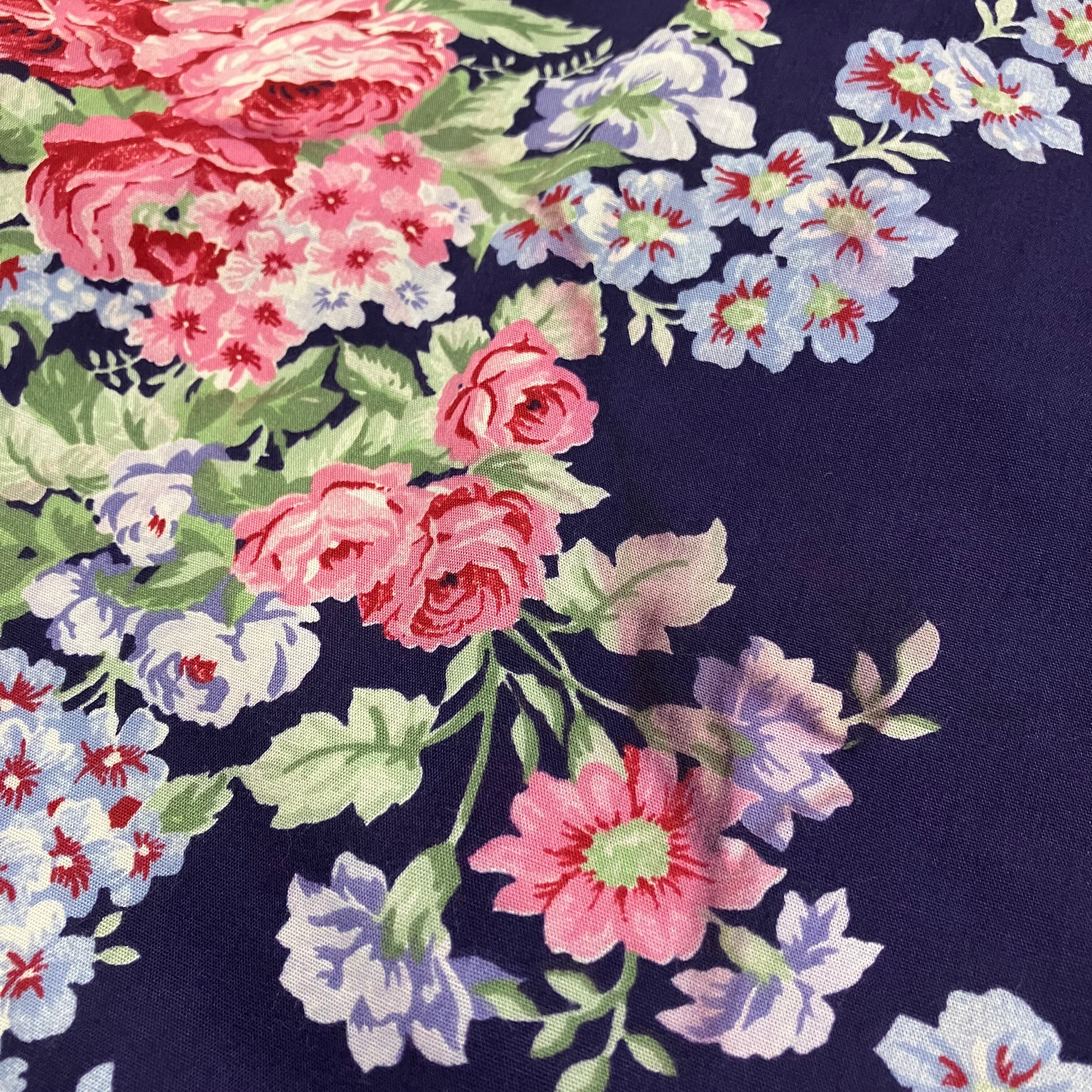 ネイビーのボディにピンク、ブルーの様々な花柄がデザインされており大人レトロな雰囲気が素敵です。生地の肌触りがよく、着心地が良いです。