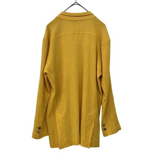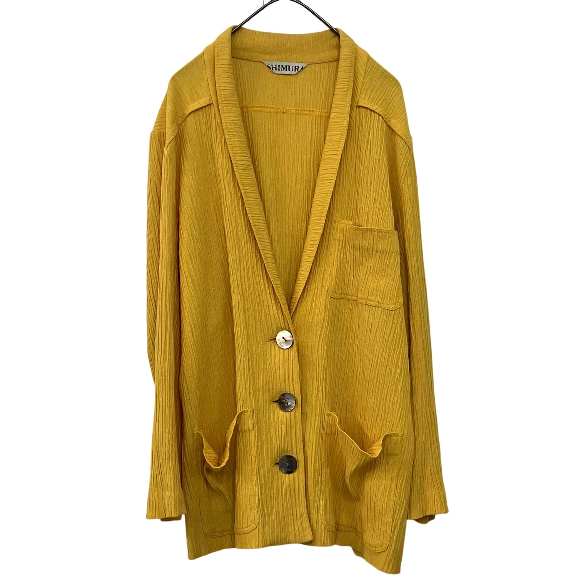 SHIMURAのショールカラープリーツテーラードジャケットです。発色の良いイエローが特徴的です。光沢感のあるボタンや裾のサイドスリットとディテールにも上品さが感じられる一着です。