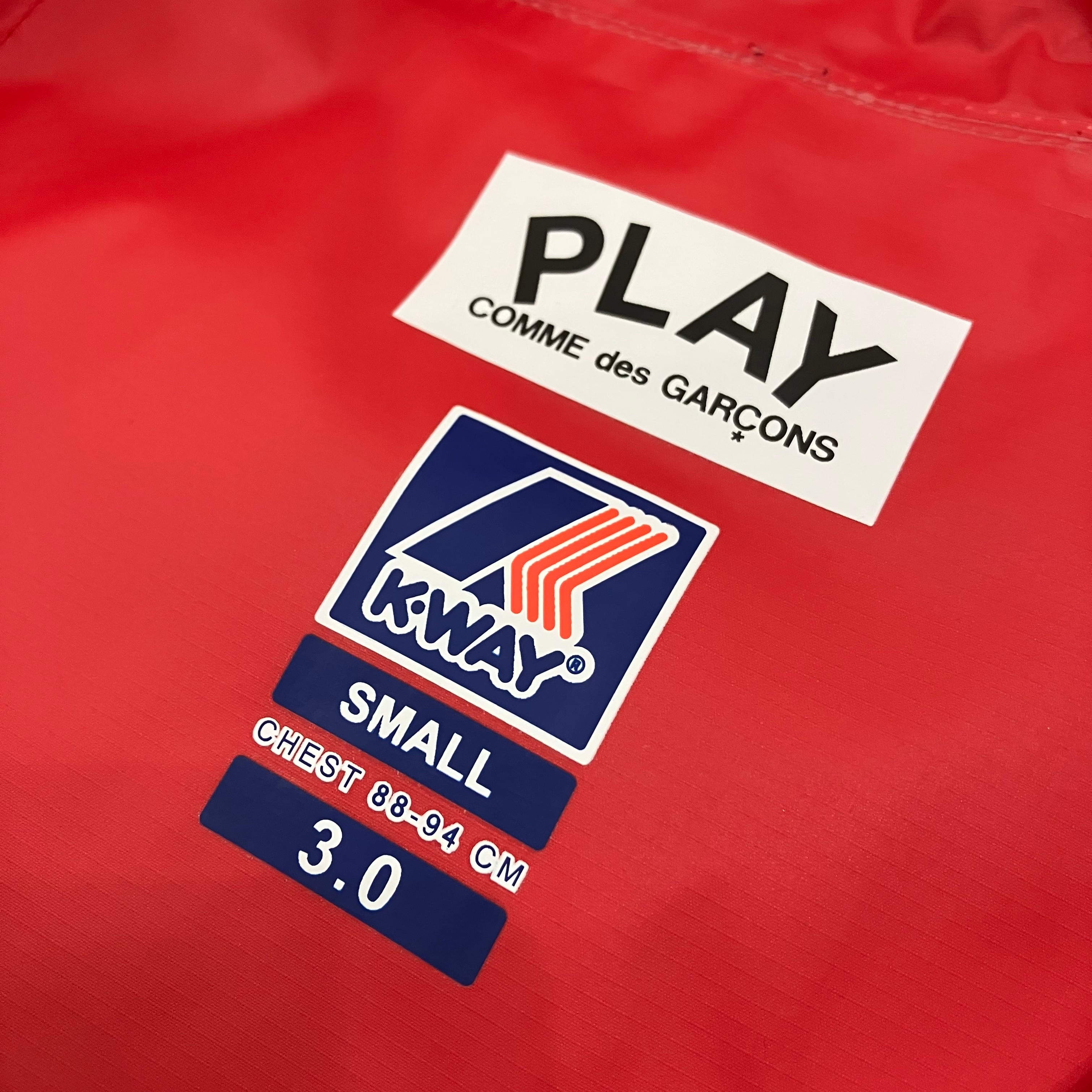 プレイコムデギャルソンの代表的なレッドカラーとK-WAYの機能性あるデザインが感じられます。