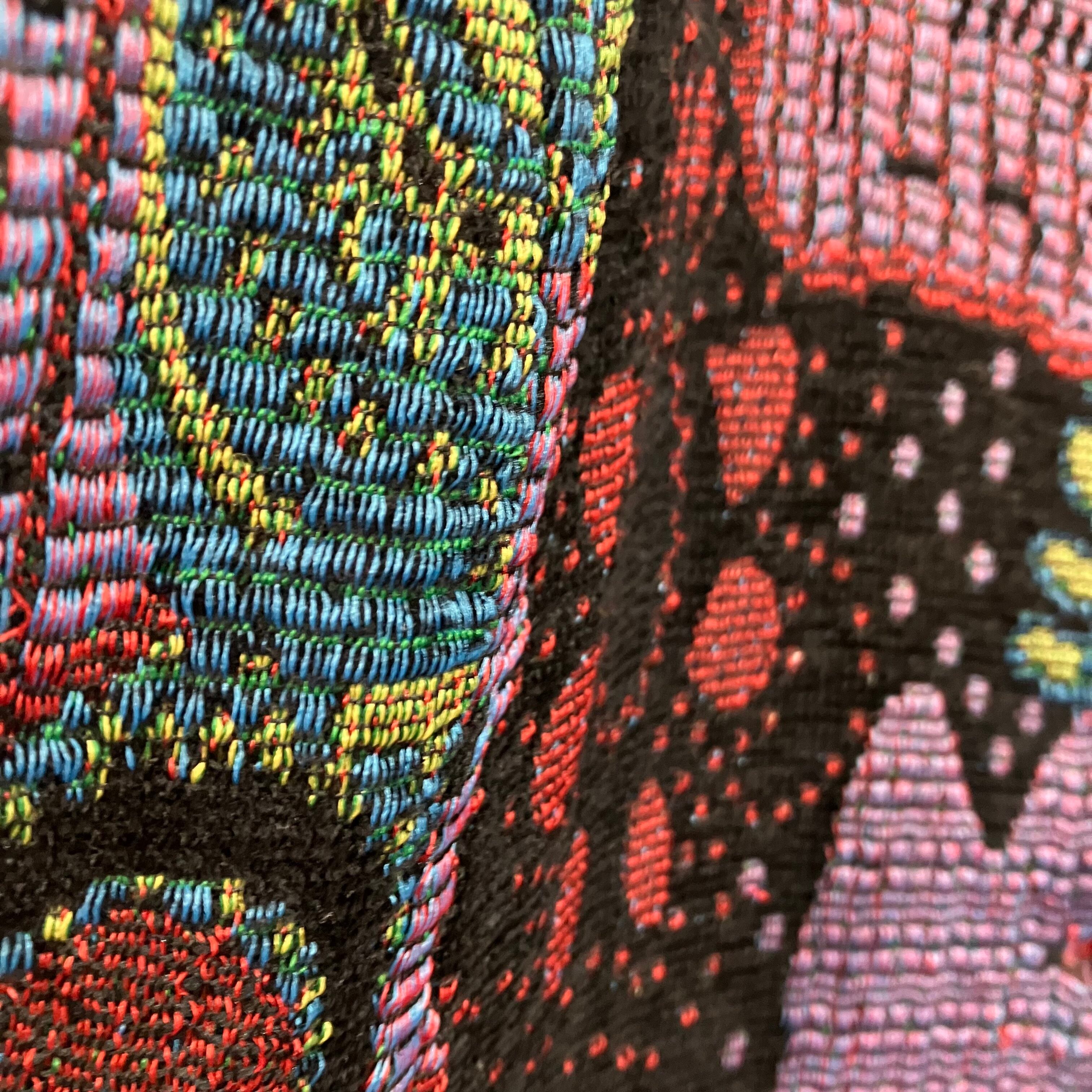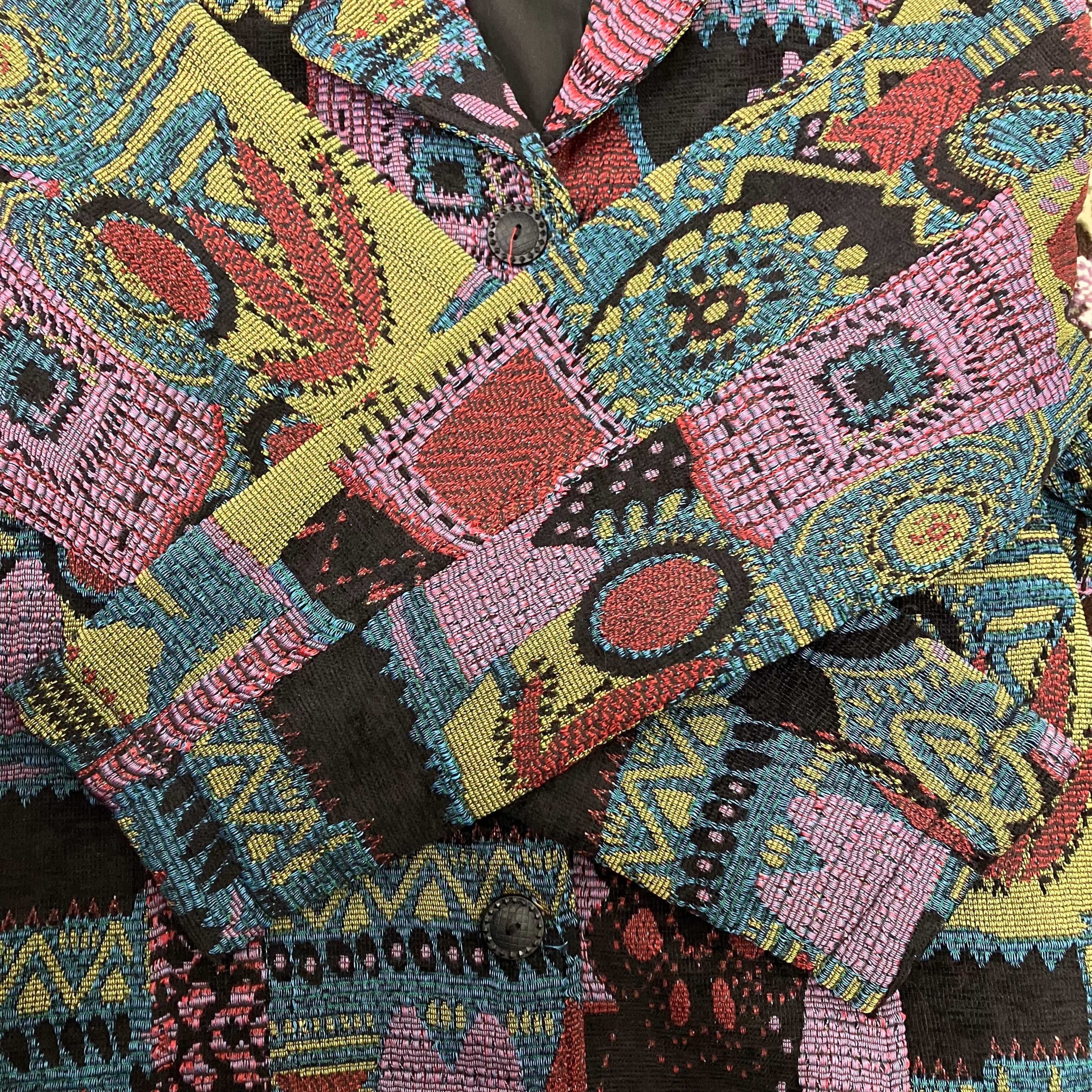 ゴブラン織りが施されたヴィンテージのジャケットです。ゴブラン織りには、プリントでは表現できない良さがあり、非常に丁寧な作りとなっております。パープルやグリーンなどの深い色味にデザインされた総柄から高級感を感じられる1枚です。個性的な柄ジャケットをお探しの方に是非。メンズでもレディースでもユニセックスにご着用いただけると思います。