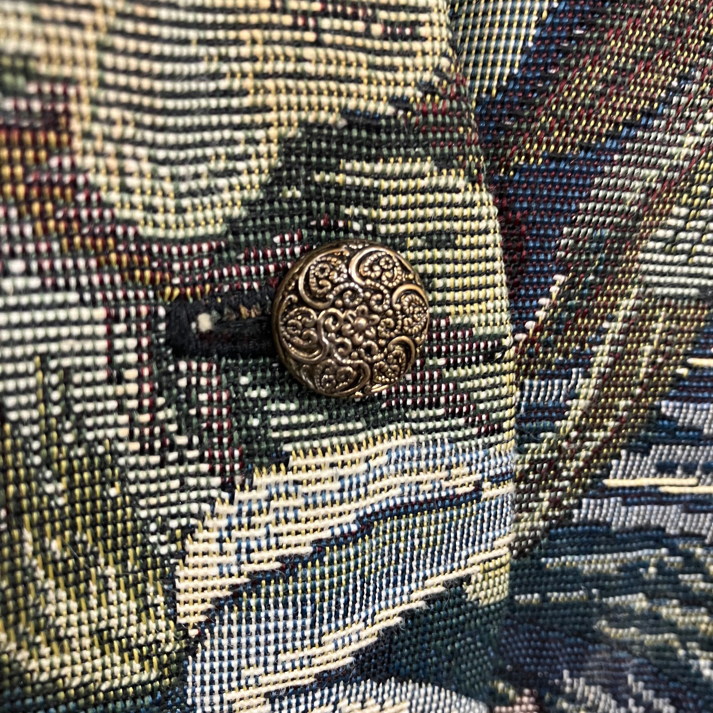 ゴブラン織りが施されたヴィンテージのベストです。ゴブラン織りにはプリントでは表現できない良さがあり、非常に丁寧な作りとなっております。落ち着いたグリーンやベージュ、パープルの色味でデザインされた総柄からは高級感を感じられ、インナーの存在感がしっかりとでる1枚です。レトロ古着がお好きな方にオススメです。メンズでもレディースでもユニセックスにご着用いただけると思います。