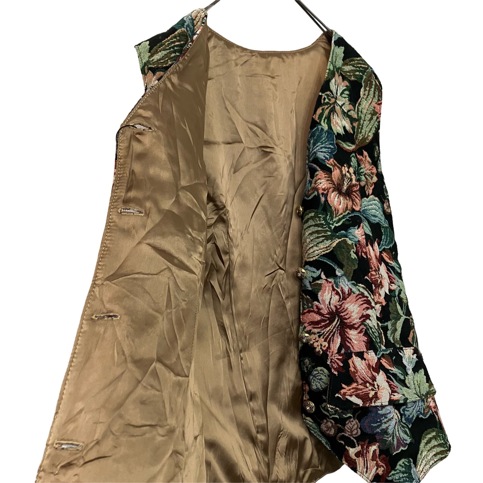 『VINTAGE corinne farber made in Canada Flower design Rhinestone button gobelins vest』USED 古着 ヴィンテージ カナダ製 フラワー 花柄 総柄 ラインストーン ボタン ゴブラン ベスト
