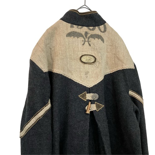 『VINTAGE genuine leather suede no collar button front belt patch design logo print big silhouette oversize Tyrol Tyrolean jacket』USED 古着 ヴィンテージ 本革 スエード レザー ノー カラー フロント ベルト パッチ ロゴ プリント ビッグ シルエット オーバー サイズ ボタン 刺繍 チロル チロリアン ジャケット