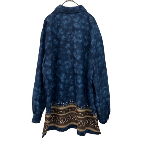 青のボディのシャツですが、下部に民族的な模様のあるシャツとなっています。