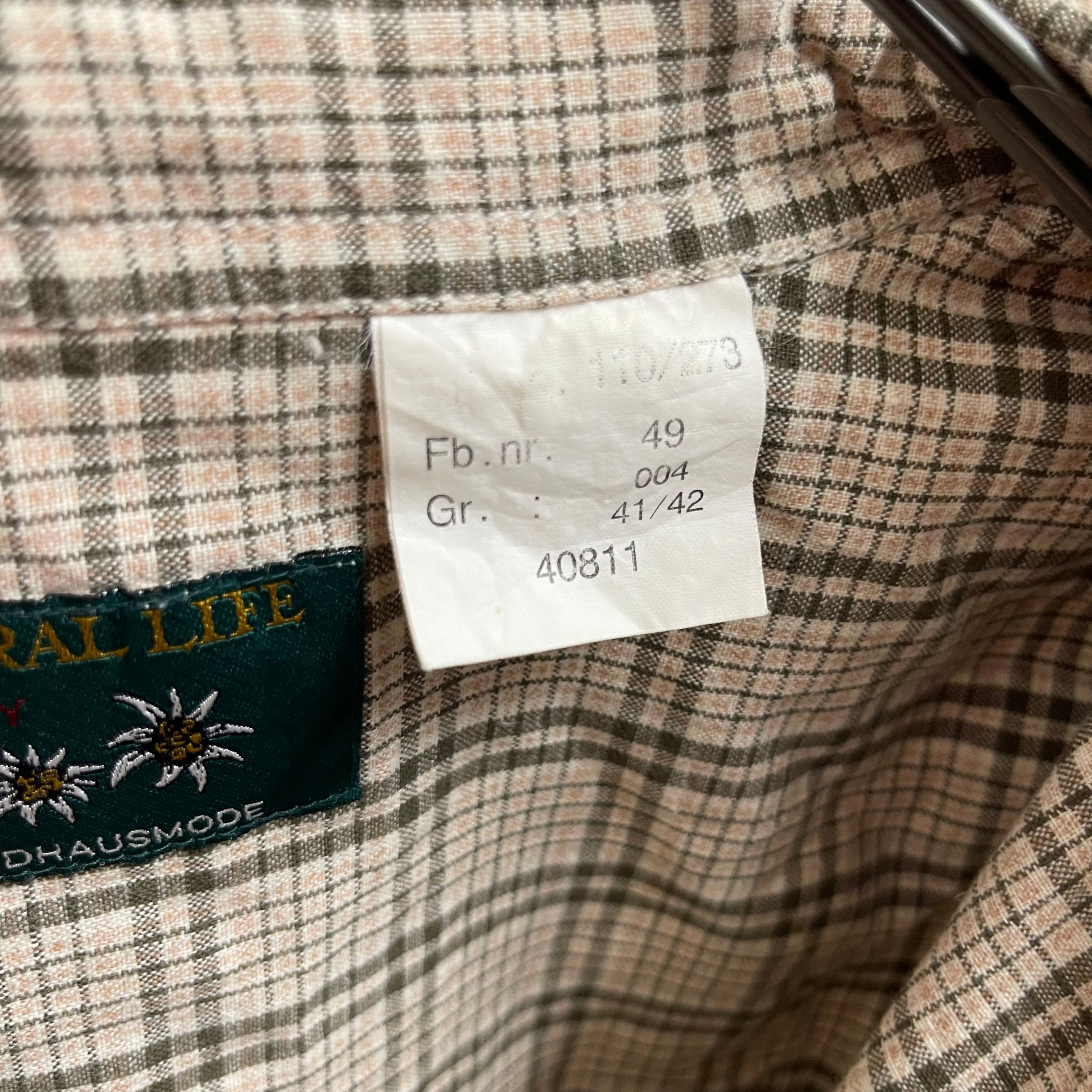 『VINTAGE NATURAL LIFE checked wood button bird leaf embroidery Cotton big silhouette over size Tyrol Tyrolean shirt』USED 古着 ナチュラルライフ ヴィンテージ ウッド ボタン バード 鳥 リーフ 刺繍 コットン ビッグ シルエット オーバー サイズ チェック チロル チロリアン シャツ