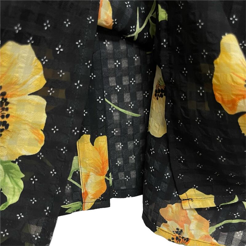 チェックの生地とフラワー柄がとてもお洒落な一着となっており、コーディネートのアクセントになります。